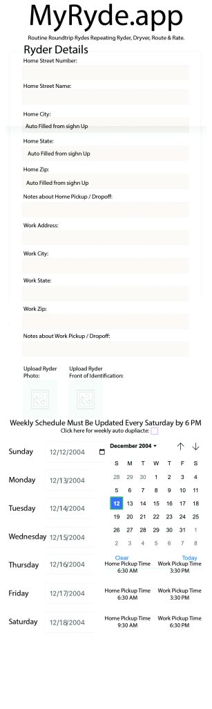 Ryders Home and Work addresses are recorded and ryders submit weekly work schedules with the option of (no change button) to duplicate schedules each week automatically without change. Photo of ryder and Identification card upload